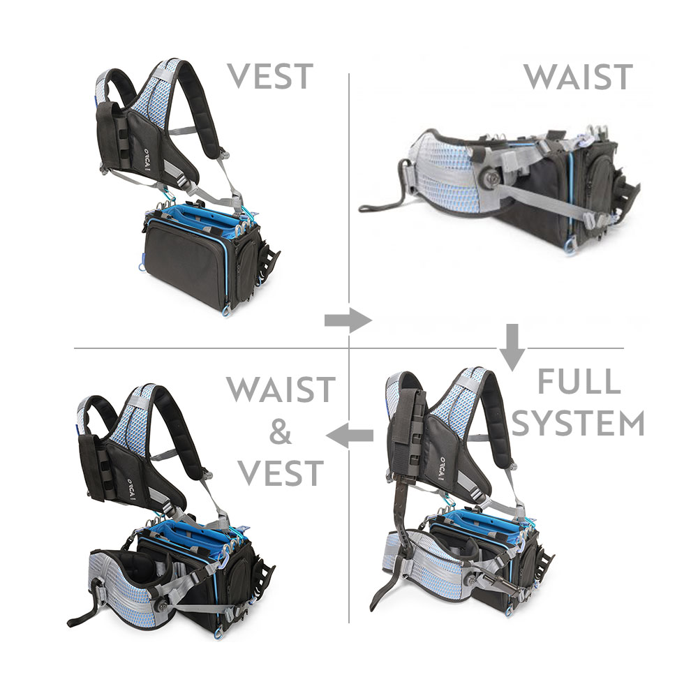 O Orca OR-445 (Spinal Support System) Sound Bag Harness é um design patenteado destinado a proteger e apoiar as costas dos operadores de áudio enquanto transportam equipamento pesado. O arnês vem num tamanho que se adapta à maioria dos utilizadores, garantindo uma solução versátil para profissionais que necessitam de mobilidade e conforto sem comprometer a segurança ergonómica.
